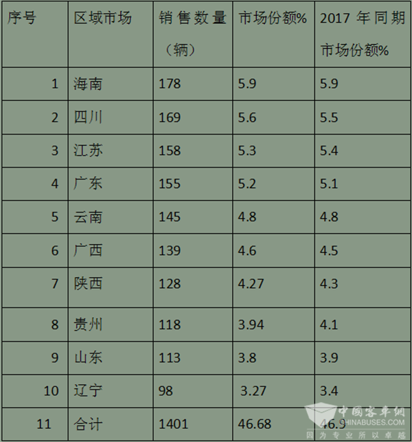 从图表可以看出: 1、2018年 1月在全国销量位于前10名旅游客车市场的海南、四川、江苏、广东、云南、广西、陕西、贵州、山东、辽宁等10个区域市场中,共销售了1401辆旅游客车,占据了46.68%的市场份额。这说明旅游客车市场不可能象高档客车那样集中度那么高,相反,旅游客车市场的集中度不高说明全国的各个市场对旅游客车来说都有机会,这也进一步证明了旅游客车产品为什么每个客车厂家都有销售,每个区域市场都能看到旅游客车在运营的主要原因了。