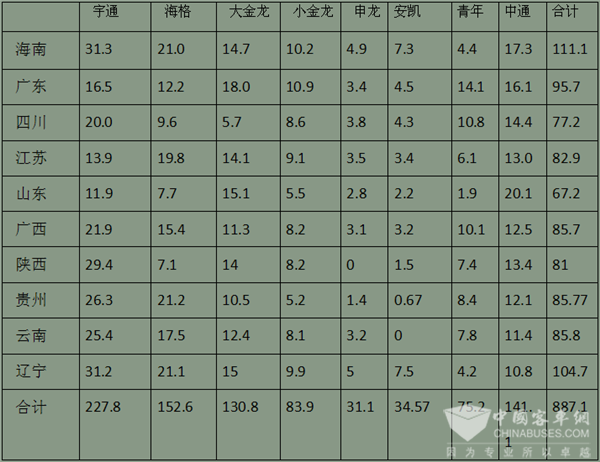 2、 在上述所列的10个主流区域市场中,作为第一旅游大市场的海南,垄断程度最高,旅游客车市场竞争最不充分,其中宇通市场份额接近三分之一,海格客车市场份额接近四分之一,大小金龙的市场份额也不低,可以说,海南旅游客车市场基本是三龙一通的天下。