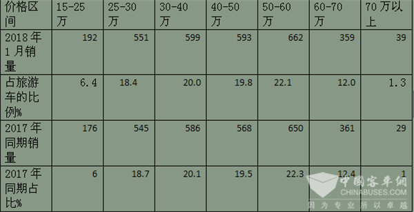 3、15-25万的价格区间销量比例为6.4%,比2016年同期的6.0%提高了近0.4个百分点,说明说明2018年1月旅游客车有明显向25万以下这一区段有更加集中的迹象。