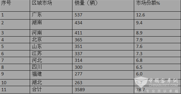 2、销量前10个区域累计销售新能源客车3589辆,占据整个市场近78.7%的市场权重,可见2018年1月新能源客车在全国区域市场的销量分布是很不均衡的。