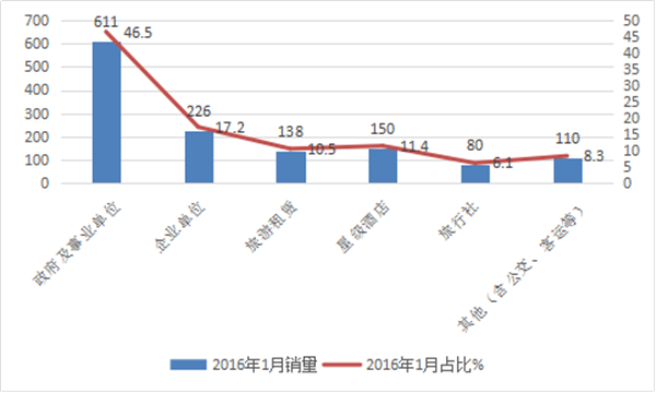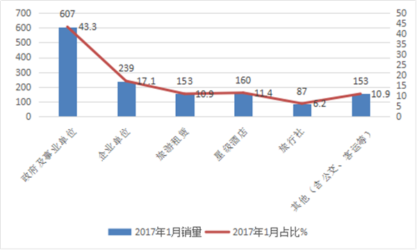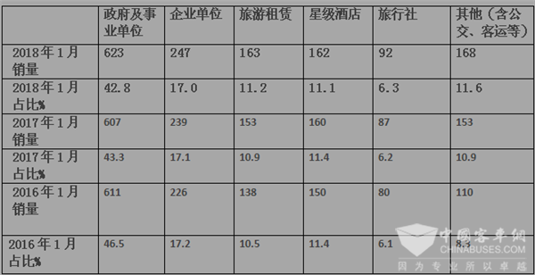 1.2018年1月政府、事业单位:市、县级政府、公检法司、教育、文化、体育、新闻、广播影视、交通、卫生、水利等事业单位用于接待、出行用车,占市场42.8%,虽仍然是最大的比例,但同比下降了0.5个百分点,主要是政府部门用车计划压缩,经费缩减所致。