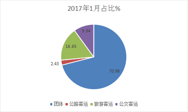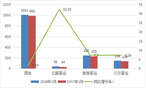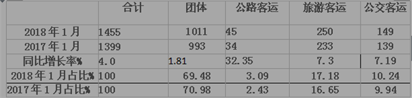 简析:2018年1月份国内考斯特市场累计销售1455辆,与2017年同期相比增长4.0%。作为政府、企事业单位、公检法司、星级酒店接待等团体市场累计销售1011辆,占据考斯特市场垄断位置;与2017年同期比较稍有增长;公路、旅游市场占据考斯特市场的20%左右,比2017年同期上升了近1个百分点;而公交客运虽然增量不大,但增幅7.19%,占市场份额为10.24%,同比2016年增长近0.3个百分点(详见上表,数据来源:车管所上牌数)。2014年新一届国家领导人上台后,尤其是19大以后大力推进并贯彻落实《八项规定》,在公费旅游、接待用车等方面严格管控,在一定程度上影响了考斯特市场用车需求,而考斯特车型在旅游市场近7.3的增长,主要是旅游租赁方面的增长拉动所致,公交方面的增长主要是纯电动考斯特车型的增长所致。