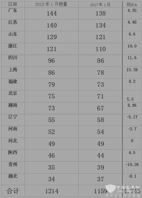 1、作为中巴市场中高端客车代表产品,考斯特的产品定位决定了客户购买能力和区域的经济实力。数据显示,考斯特市场排前十五名区域中,广东、江苏、浙江、山东和四川排名前五位,占据市场份额的43.29%;上海、福建、北京、湖南和辽宁排名第六到第十位,占据市场份额的25.29%,河南、河北、陕西、贵州和湖北位列第十一到第十五,占据市场份额的12.1%,其他16省、市占据19.32%市场份额(详见下表,数据来源:车管所上牌数)。