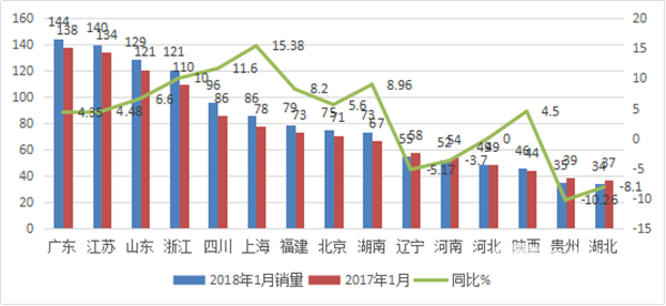 4、2018年1月各区域市场销量增幅统计%(来自上牌数据统计计算):