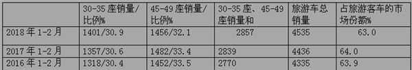按座位数来细分旅游客车市场,30-35座、45-49座左右的旅游客车受旅游市场青睐,市场集中度达到63.0%,比2017年同期低;其中30-35座产品市场份额比2017年和2016年同期均有所上升,45-49座的产品市场份额比2017年和2016年均有所下降。根据对目标用户的调查,旅游团分为大团和小团,一般大团在47人左右,小团在33人左右,所以,旅游客车主要集中在10-11米、11-12米、8-9米和7-8米等长度段上, 2017年1-2月旅游车30—35座与45-47座位销量、比例情况与2017年及2016年同期比情况如下表:表1