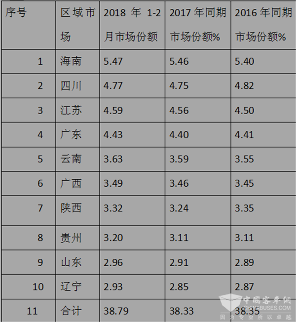从上图表可以看出: 1、2018年 1-2月在全国销量位于前10名旅游客车市场的海南、四川、江苏、广东、云南、广西、陕西、贵州、山东、辽宁等10个区域市场中,共销售了2147辆旅游客车,占据了38.79%的市场份额,与2017年同期是稳中有升。这说明旅游客车市场不可能象高档客车那样集中度那么高,相反,旅游客车市场的集中度不高说明全国的各个市场对旅游客车来说都有机会,这也进一步证明了旅游客车产品为什么每个客车厂家都有销售,每个区域市场都能看到旅游客车在运营的主要原因了。。