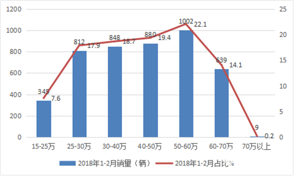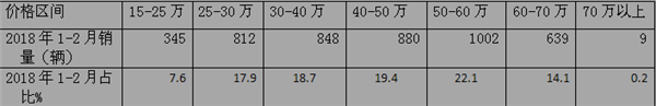 1、2018年1-2月旅游客车主要销售集中在价格在50-60万、30-40万和、40-50万等区间。