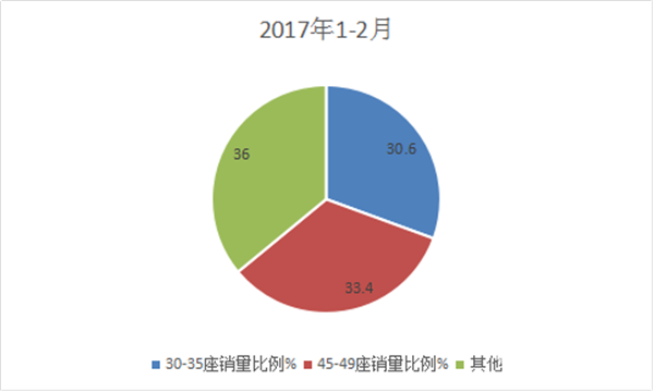 1)2016年前2月—2018年前2月,30-35座的销量及占比均出现连续在上升的现象。