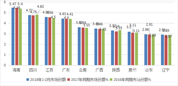 5、前10名销量区域市场份额总和达到38.79%,与2017年同期比集中度提高了0.46个百分点,比2016年同期加大了0.34个百分点,足以说明重点区域市场份额在加大后基本处于平稳状态.