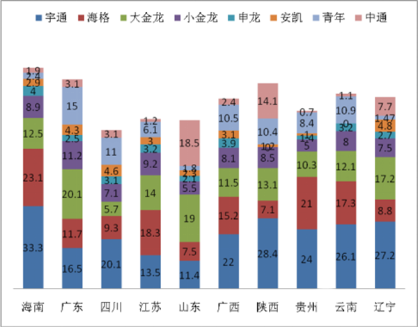 2、 在上述所列的10个主流区域市场中,作为第一旅游大市场的海南,垄断程度最高,旅游客车市场竞争最不充分,其中宇通市场份额接近三分之一,海格客车市场份额接近四分之一,大小金龙的市场份额也不低,可以说,海南旅游客车市场基本是三龙一通的天下。