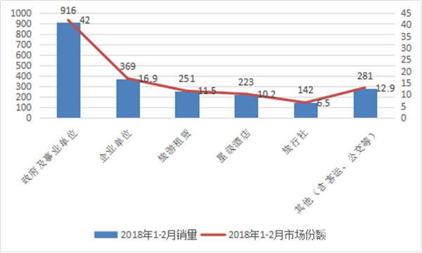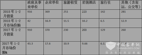 根据最新上牌数据统计, 2018年1-2月累计销售中高端考斯特客车车型2182辆,同比(2017年1-2月销售2102辆)增长3.8%,按照目标客户所在的行业划分,各细分市场的销量及市场份额如下表: