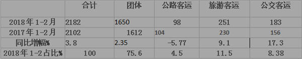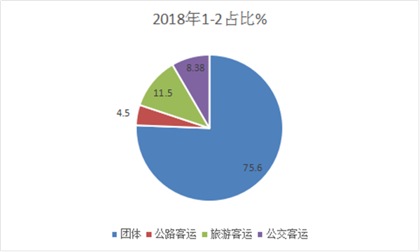 2018年1-2月份国内考斯特市场累计销售2182辆,与2017年同期相比增长3.8%。作为政府、企事业单位、公检法司、星级酒店接待等团体市场累计销售1650辆,占据考斯特市场75.6%的市场权重,处于垄断位置,但比2017年同期下降了0.19个百分点;公路、旅游市场占据考斯特市场的16%左右,比2017年同期提高了大约2个百分点;而公交客运虽然增量不大,但增幅最大,但基数较低,仅占市场份额的8.38%左右(详见上表,数据来源:车管所上牌数)。2012年新一届国家领导人上台及19大后,大力推进并贯彻落实《八项规定》,在公费旅游、接待用车等方面严格管控,在一定程度上影响了考斯特市场用车需求,而考斯特车型在旅游市场近9.1%的增长,主要是旅游租赁方面的增长拉动所致。