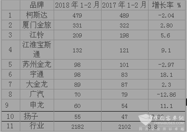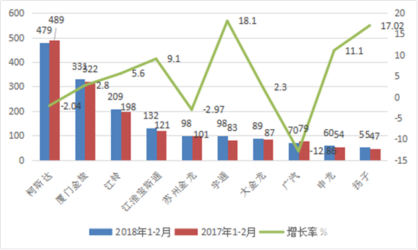 自主品牌中厦门金旅和江铃考斯特表现尚可,2018年1-2月分别销售331辆和209辆,与2017年同期相比分别增长2.8%和5.6%,销量分别是国产品牌中最大和第二,占据市场份额分别为15.17%和9.58%,比2017年同期(2016年1-2月金旅考斯特市场占有率为15.31%,江铃为9.42%)分别减少0.14和0.16个百分点;江铃考斯特作为后起之秀,近几年增幅较大。江淮宝斯通、苏州金龙分布第四、五位,占据近6%和4.5%的市场份额。前5名当中,合资品牌丰田柯斯达销量同比下降近2.04个百分点,自主品牌均有不同程度的增减。从行业品牌集中度来看,前5家企业占据绝对垄断地位,短期内很难打破市场竞争格局。在国家公布公车改革方案中,一方面国家严格控制公务用车数量,取消一般公务用车配置;另一方面强化对自主品牌的扶植力度,今后所有政府用车都将优先采用自主品牌汽车,国家政策的支持必将带来自主品牌汽车发展。