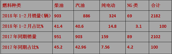 2018年1-2月考斯特客车销量中,柴油占据了第一大的权重,但同比也下降;经市场调研,主要用于公路客车和旅游客运市场,由于柴油发动机油耗较低,使用成本较低,因此靠营运赚取经济效益的公路客运和旅游客运市场一般比较讲究成本。