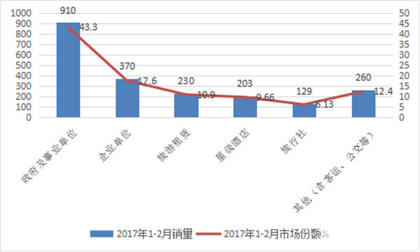 2.企业单位:外资、合资、大型国企、民营企业等用于接待、员工福利用车,占市场的16.9个百分点,同比2016年的17.6%下降了0.7个百分点;