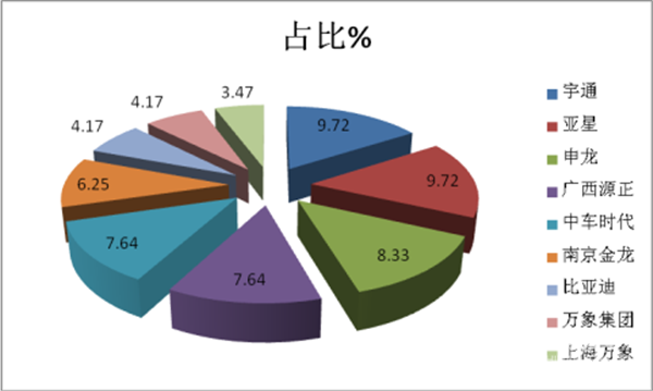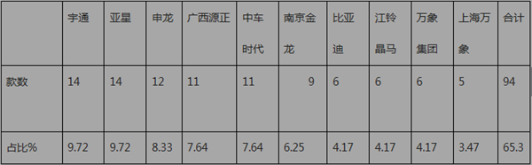 特点二:宇通客车和扬州亚星入选车型最多,并列第一;前10家入选款数占比为65.3%