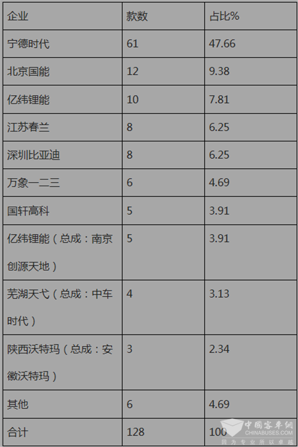 电池系统能量密度超过135Wh/kg的产品分别搭载的是宁德时代、北京国能、亿纬锂能、江苏春兰和深圳比亚迪(总成:汕尾比亚迪)等企业生产的电池。其中宁德时代占比达到47.66%,为最多。