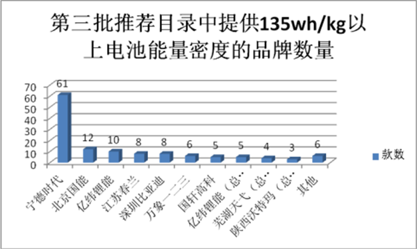特点五:宁德时代提供的动力电池能量密度大于135Wh/kg的款数最多,占比为47.66%