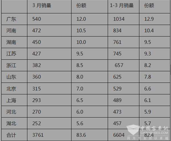 根据上牌信息统计,2018年3月及1-3月全国重点区域市场新能源客车销量分布统计表: