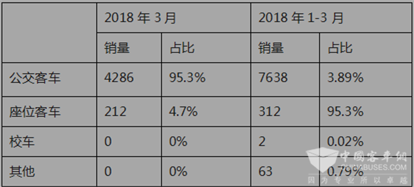 根据中国客车统计信息网统计,2018年3月及1-3月新能源客车按目标用途划分销量结构统计表:
