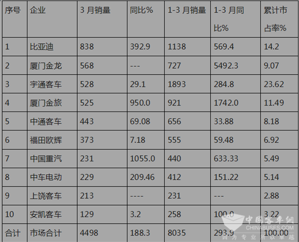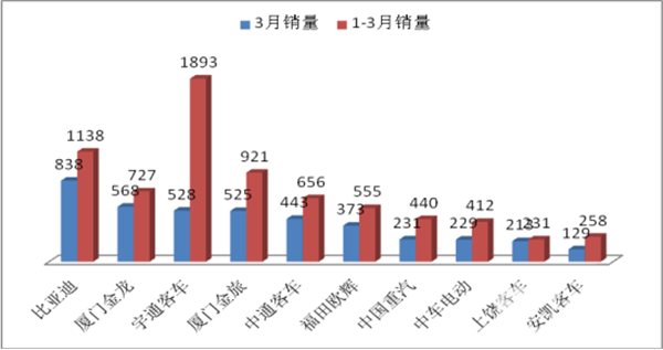 根据中国客车统计信息网统计,2018年3月及1-3月重点客车企业新能源客车销量排名统计表: