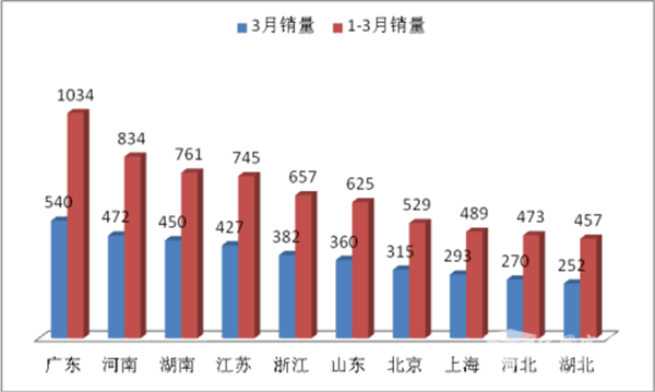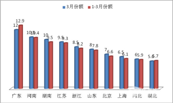 1、2018年3月及1-3月,全国前10名销量区域销量集中度分别为83.6%和82.4%,均超过了80%,说明区域流向分布不均,重点区域市场集中度较高。
