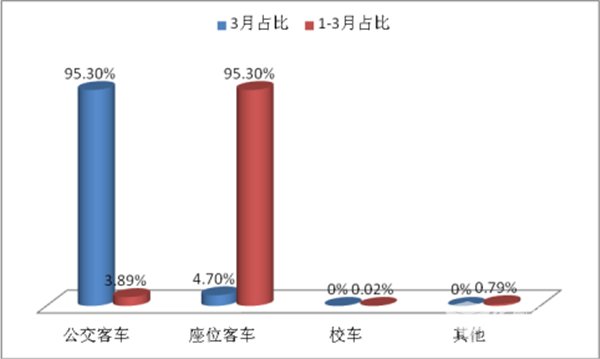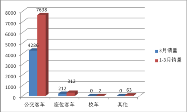 1、从细分车型来看,3月份新能源客车市场依然以公交车为主,单月销售新能源公交4286辆,占比95.29%;一季度累计销售7638辆,占比95.30%。其他客车车型合计占比未超过5%。这也说明,目前国内新能源客车的大客户还是以各地公交公司为主。座位客车市场还有待进一步开拓。