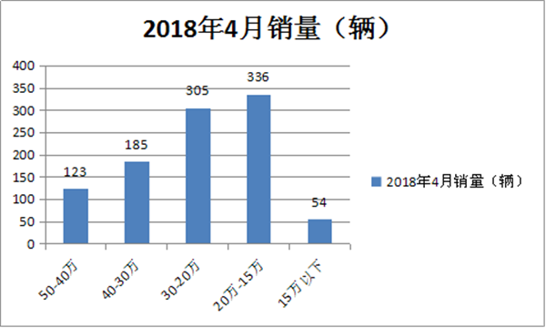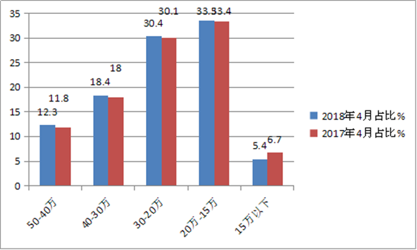 4、在30万-50万之间的价格区间,2018年4月的占比均提高了,主要是因为发动机都换国V排放了,价格当然要比原来的国IV要提高。