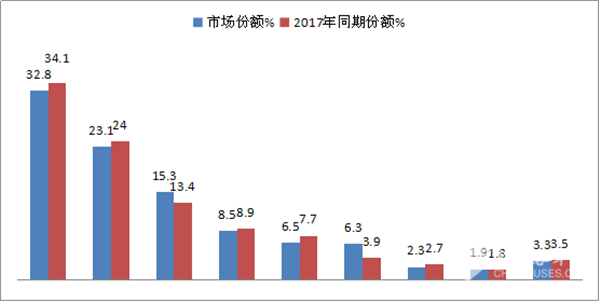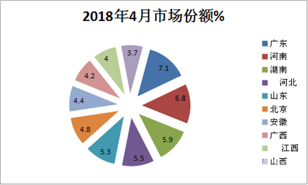 上图表数据表明,2018年4月重点区域市场的市场集中度只有51.7%,同比下降了近1.7个百分点,说明市场垄断程度有所减弱。