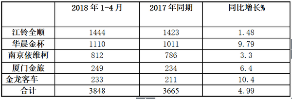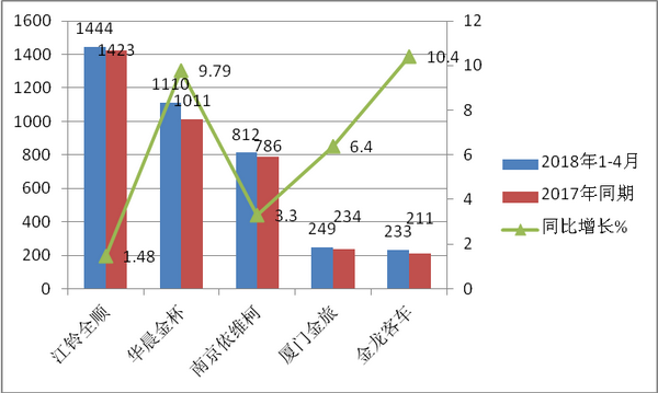 2018年1-4月轻客销量排名前5家企业河南区域销售情况