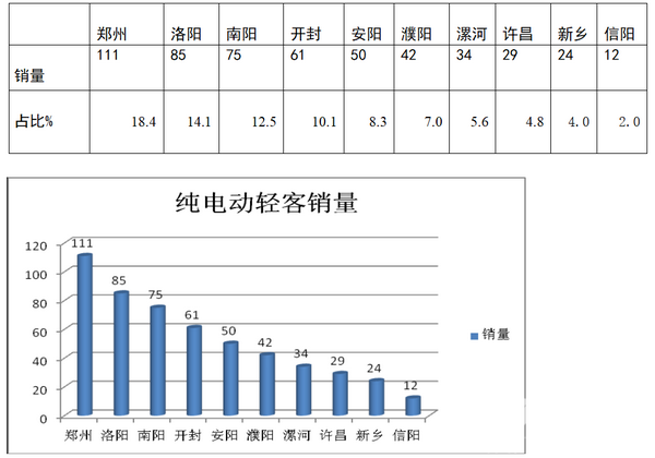 河南区域1-4月轻客纯电动客车销量流向10个地市,其中郑州地区市场占有率最高,超过六分之一的比例。其次是新乡。