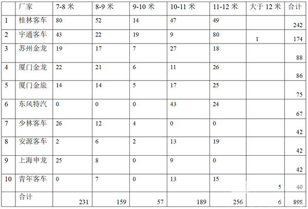 1、 销量前10名主流企业共销售大中客898辆,占总体销售1219辆的73.67%,也就是说前10名客车品牌在广西的市场集中度为73.67%。