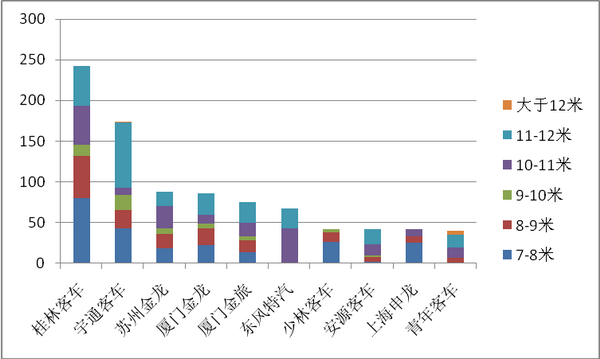 广西市场,11-12米是主打产品,其次是7-8米,再次是10-11米,销量最小的是12米以上的特大型客车,次小的是9-10米,再次是8-9米,最小的是特大型客车。