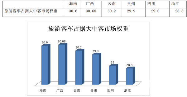 解析:位居全国旅游市场前六名的区域市场中,广西旅游客车占据大中客市场的权重为30.68%,权重最高,可见,旅游市场在广西的地位。