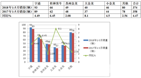 3、 广西2018年1-5月大中型旅游客车市场的同比增幅为4,47%大于其大中客市场的1.67%的增幅。