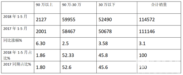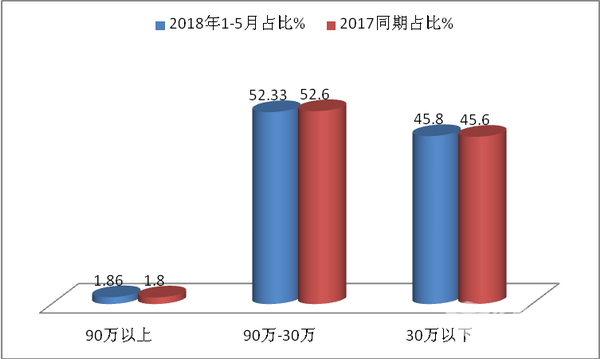 1、2018年1-5月30-90万的中档客车销量占据了大中客总销量的52.33%,超过了大中客的半壁江山,且销量同比涨幅达到2.5%,涨幅最小,30万以下中低档客车增幅为3.58%,位居第二。