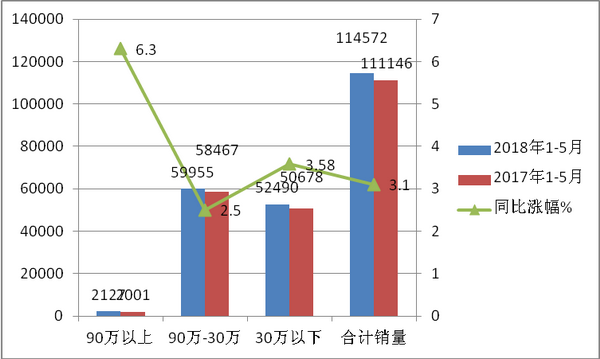 根据统计,2018年1-5月与2017年同期按价格划分客车销量结构如下: