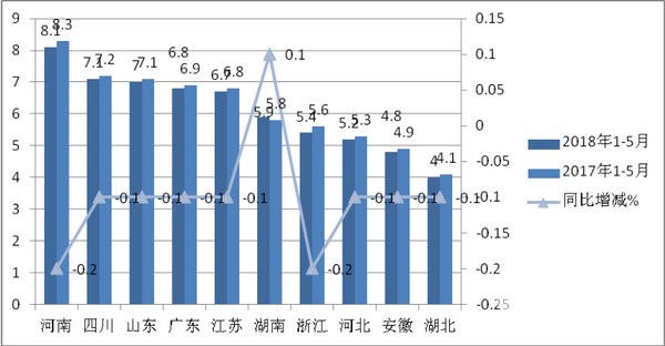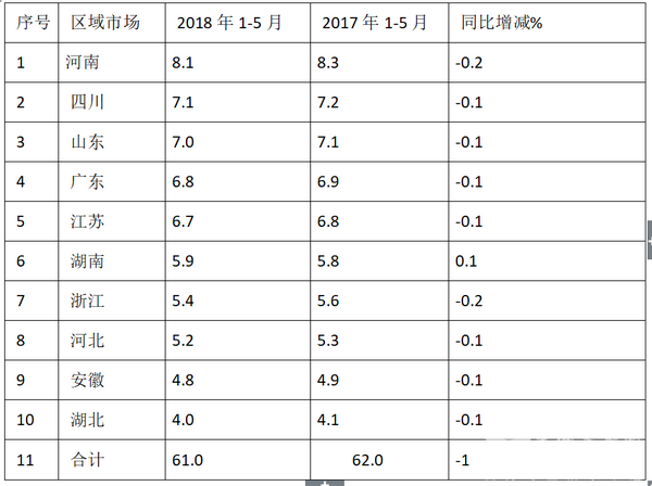 根据统计,全国销量前10名的主流区域,2018年1-5月价格在30万以下的低档客车市场份额与去年同期比较统计表(%):