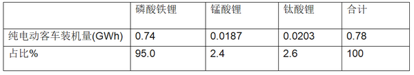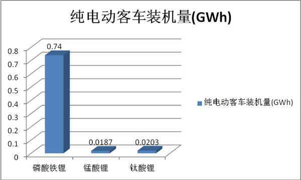纯电动客车中,磷酸铁锂电池装机量占比为95%,处于绝对的垄断地位。主要是因为磷酸铁锂电池安全性能比较好。这对载人的客车来说是至关重要的;钛酸锂电池装机总量占比为2.6%,占比次大,最小的是锰酸锂电池,占比2.4%。