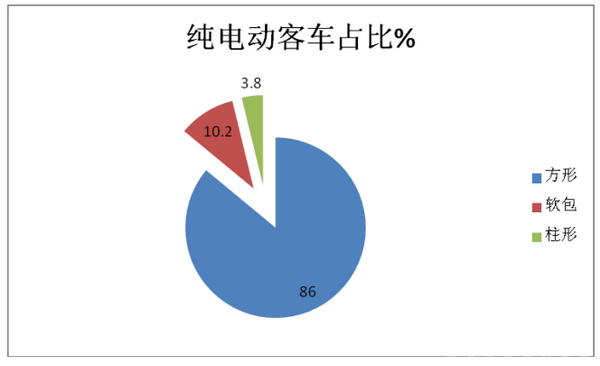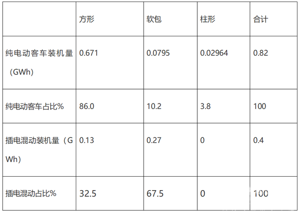 可见,纯电动客车中,方形电池装机量最大,占比达到86%;插电式混动客车中,软包型电池装机量最大,占比达到67.5%