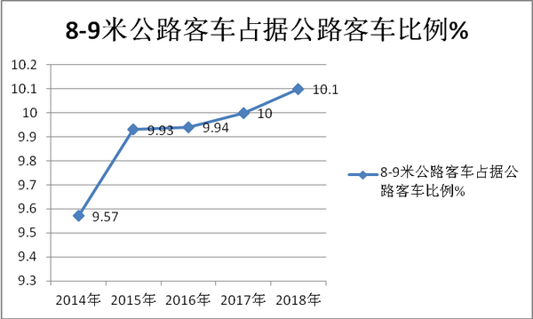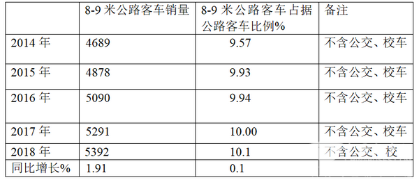 1、2014年-2018年近5年前6月,8-9米公路客车销量占据当年公路客车总量的比例从2014年的9.57%逐年提高到2018年的10.1%,说明8-9米公路客车在公路客车市场中的权重越来越大