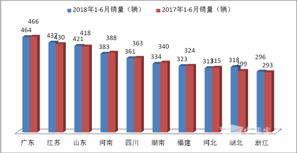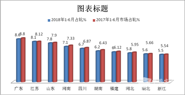 1、2018年1-6月广东等10名重点区域8-9米公路客车市场集中度达到67.4%,比2017年同期的68.7%降低了1.3个百分点,重点市场的垄断程度降低。
