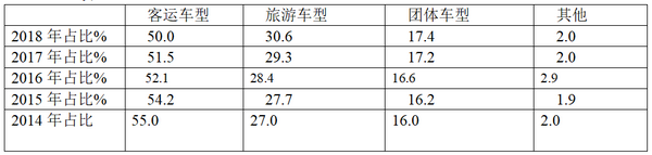特点五:客运车型占据份额最大,但逐年下降;旅游车型和团体车型占比逐年上升