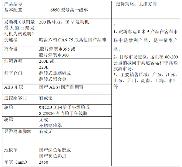 1、根据市场调研可知:在8-9米座位车中,以2018年前6月8米5左右的国产中型高一级车销量为最大(从上面分析可知约占8-9米公路客车销量的三分之一),以此长度段的车型来说明8-9米公路客车的主要配置情况和具有一定的代表性,表6