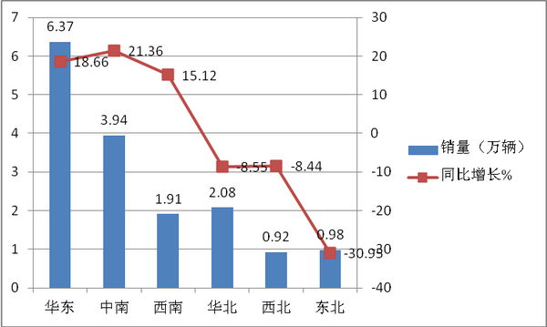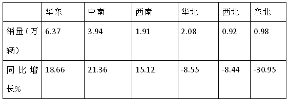 特点一:华东销量最大,中南同比增幅最大,东北同比降幅最大