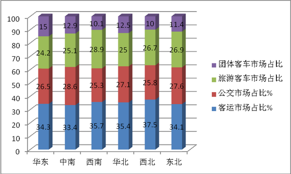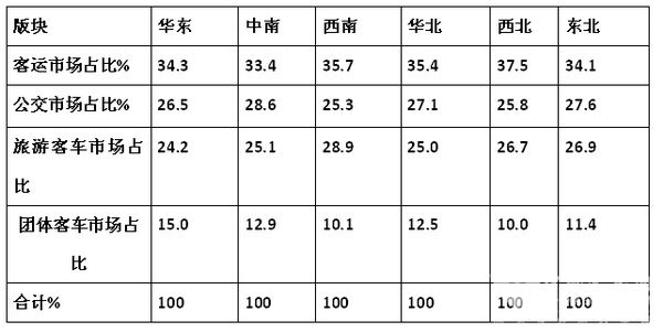 特点三:西南版块旅游市场占比最大,华东版块团体客车市场占比最大,中南版块公交市场占比最大,西北版块客运市场占比最大
