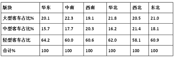 特点四:华东版块轻客市场占比最大,中南版块大型客车市场权重最大,西南版块中型客车市场占比最大