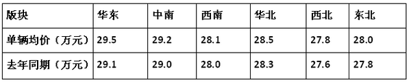 1、 全国六大版块中,华东版块单辆售价最高,其次是中南版块,再次是华北版块。