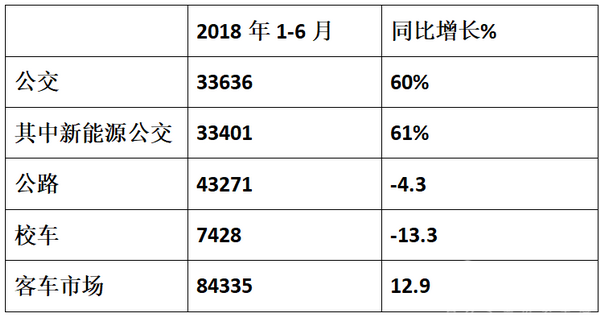 2018年1-6月新能源公交销量33401辆,同比增长61%,是上半年客车市场的增幅最大的细分市场,也是推动上半年客车市场增长的最大动力。