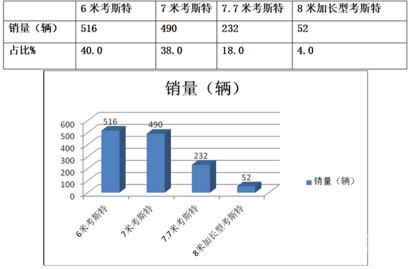 1、6米考斯特客车销量占比最大,达到40.0%,主要目标市场是小型商用车市场、城乡公交市场、小型旅游包车市场、中短途客运市场等。